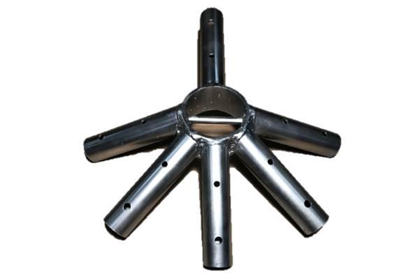 6 way crown fittings are utilized on Dremcor's Select Series west coast style 20, 30, and 40 wide frame tents. This fitting serves as the connection point for the rafters, hip rafters, side tees, and tube extending toward the other 6 way crown. Dremcor 6 way crowns are interchangeable with most manufacturer west coast style frame tents with a 5' roof pitch.